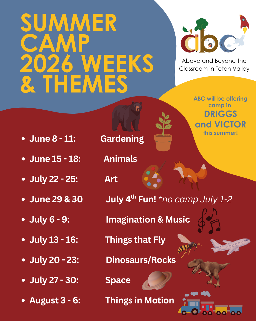 ABC is expanding to two locations this summer: Driggs (RUES) AND Victor (VES)!